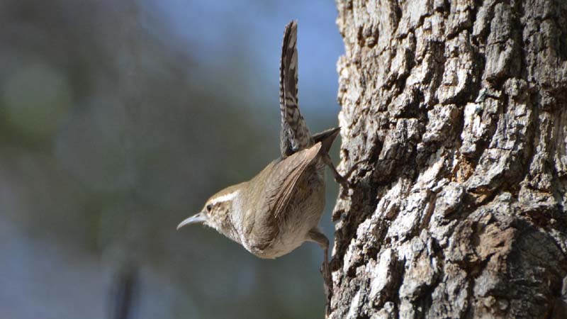 The house wren is found in open shrubby woodlands and in backyards.